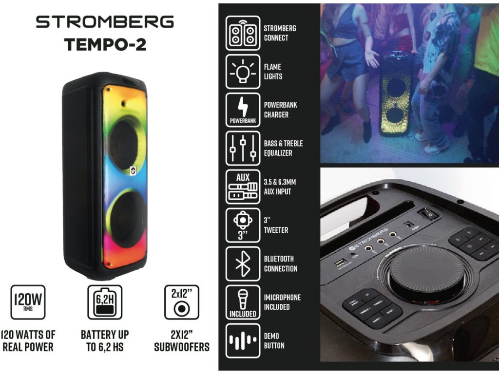 Stromberg TEMPO-2 přináší pořádnou dávku zvuku, světla a zábavy. Výkonný Bluetooth reproduktor o výkonu 120 W s RGB LED podsvícením rozzáří každou párty. V balení najdete také mikrofon, se kterým si užijete karaoke i moderování. Díky funkci Stromberg Connect můžete propojit dvě jednotky TEMPO-2 a vytvořit skutečný stereo zážitek. S výdrží až 6,2 hodiny na jedno nabití zvládnete v pohodě ozvučit i delší večírek.