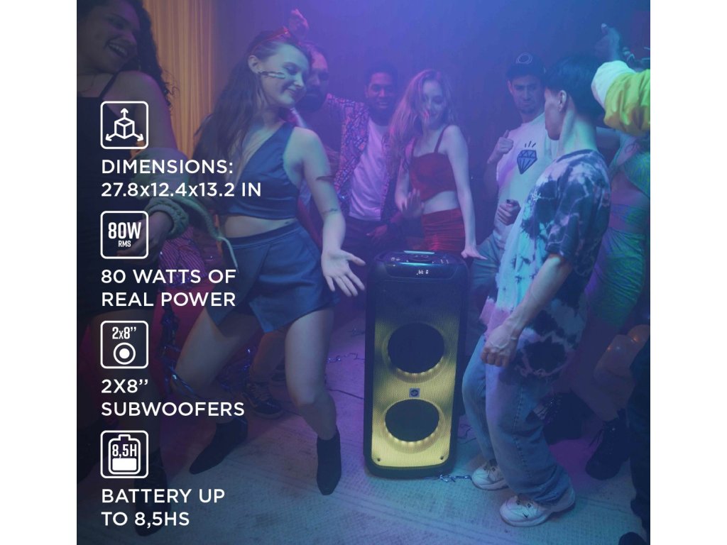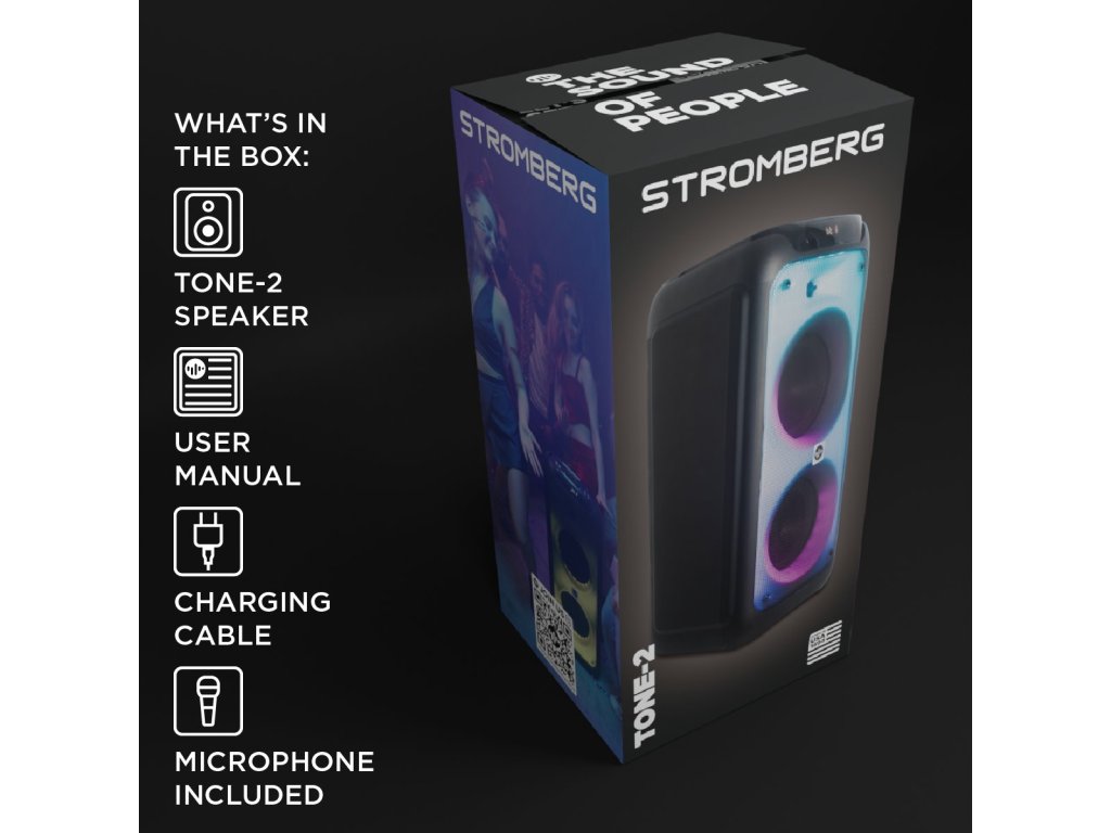 Stromberg TONE-2 – výkonný Bluetooth reproduktor, který rozzáří každou akci. S RGB LED podsvícením, výkonem 80 W a mikrofonem v balení je ideální volbou pro večírky, karaoke i domácí poslech. Technologie Stromberg Connect umožní propojení dvou jednotek a vytvoření stereo efektu. Díky výdrži až 8,5 hodiny si užijete hudbu bez přerušení, ať jste kdekoli.