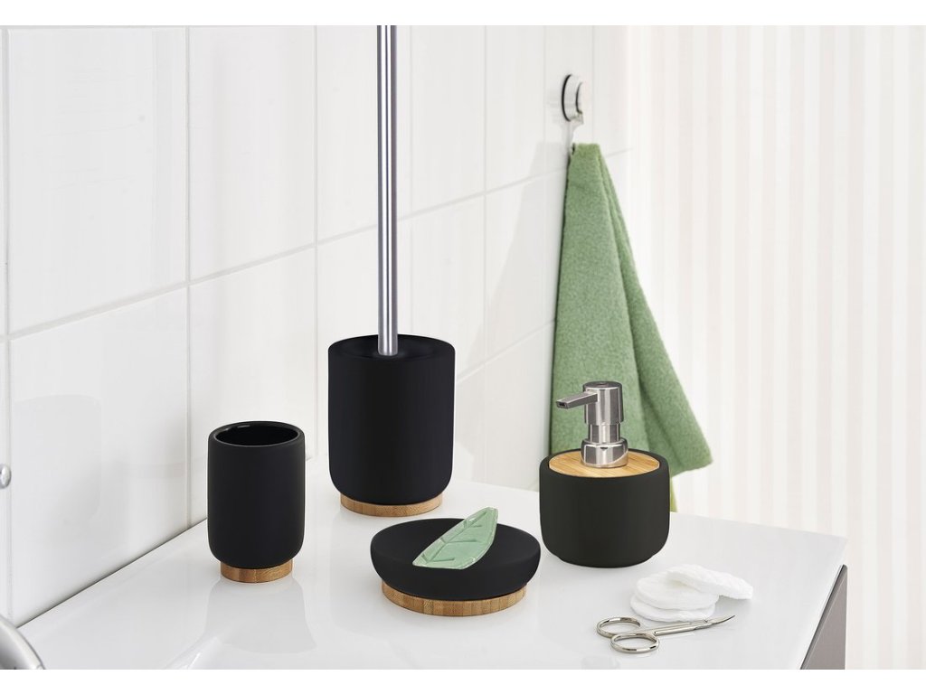 Série doplňků FANCY na první pohled zaujme zdařilým provedením. Příjemně oblé tvary a výběr ze tří barev (bílá, černá a tmavě zelená) je opravdovým lákadlem pro každou koupelnu. Stylové doplňky jsou vyrobeny z keramiky, která je potažena matným soft-touch povrchem, a bambusu.