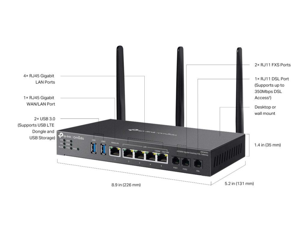 Router je vybaven 3 porty RJ11 (2x FXS a 1x DSL) a 5 gigabitovými RJ45 porty (1x WAN/LAN port a 4x LAN port), které splňují různé požadavky na připojení k internetu. Funkce Load Balance vyvažuje zátěž mezi DSL a Ethernet WAN připojením. Dva USB 3.0 porty poskytují vyšší přenosovou rychlost pro mobilní připojení.