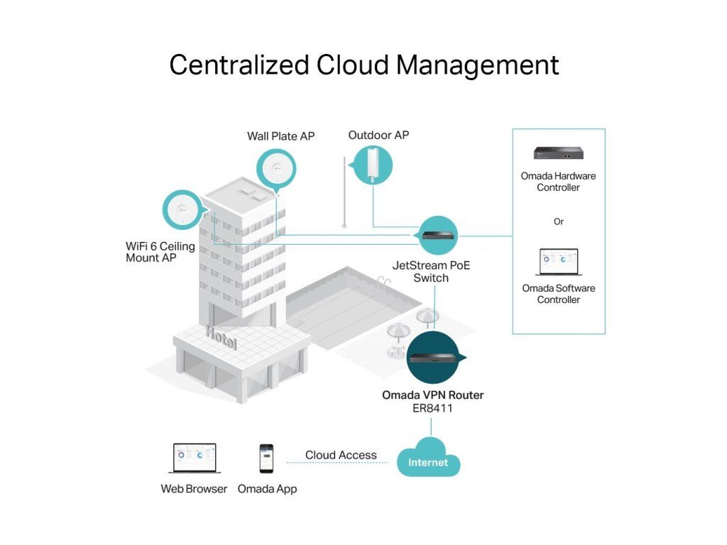 - Centralizovaná správa pomocí cloudového přístupu a aplikace Omada