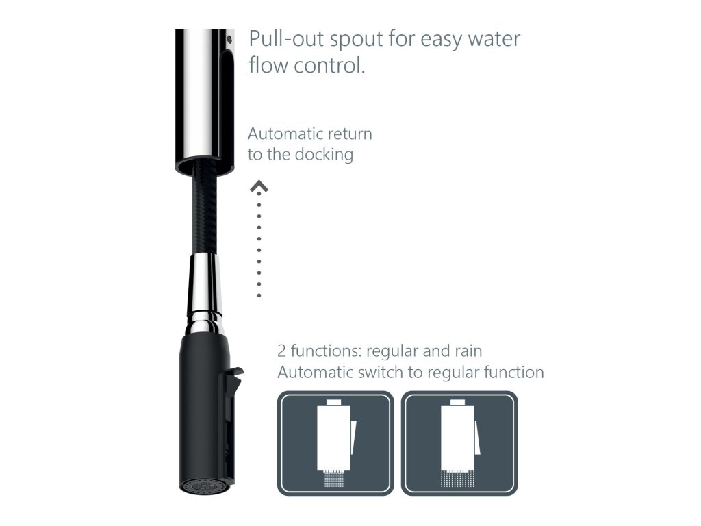 - Výsuvná 2-polohová sprška vám nabízí vysokou flexibilitu při čištění pánví, hrnců a každého rohu dřezu. Díky velkému rozsahu pohybu můžete bez omezení plnit nádoby jakéhokoli typu a velikosti.