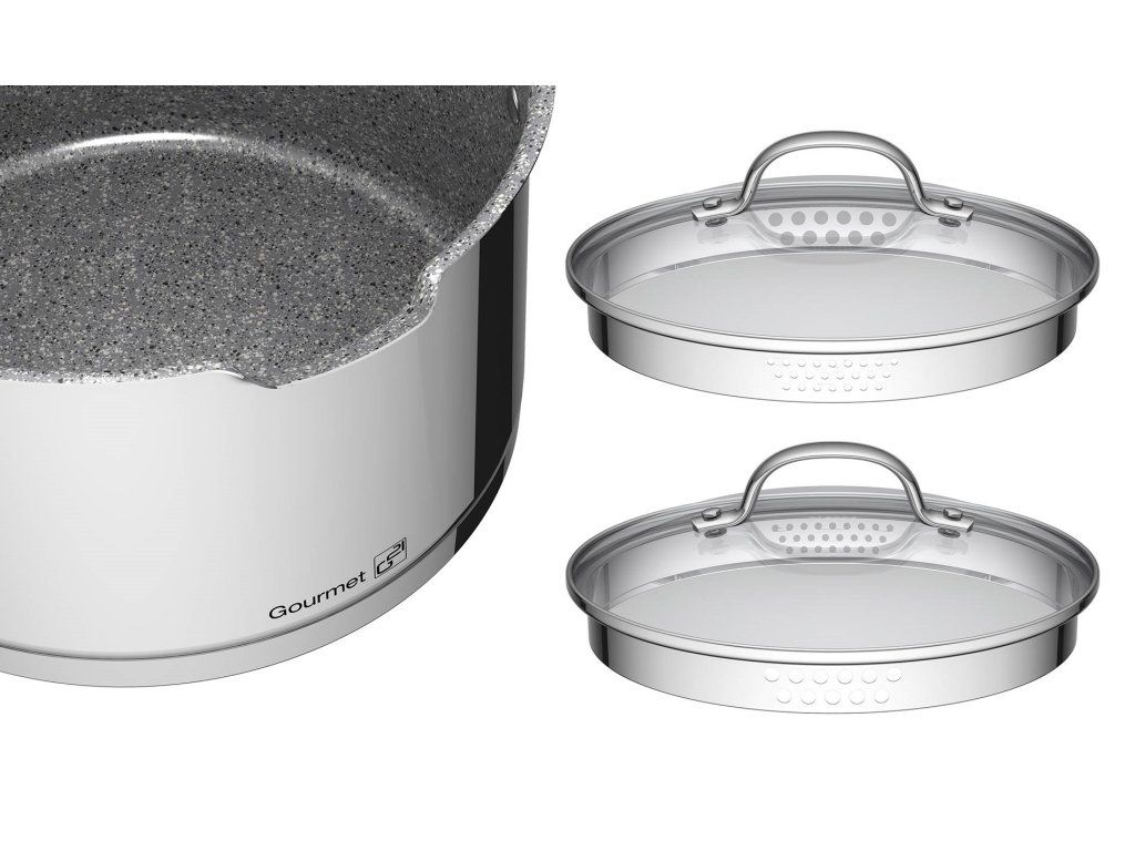 Obrovskou výhodou oproti běžně používaným hrncům jsou výparníky/cedníky, kterými jsme osadili všechny poklice v sadě. Už si nepopálíte ruce při slévání horké vody z brambor či těstovin. Pro rychlejší uvedení surovin k varu jen pootočíte poklicí a výparník/cedník se uzavře.