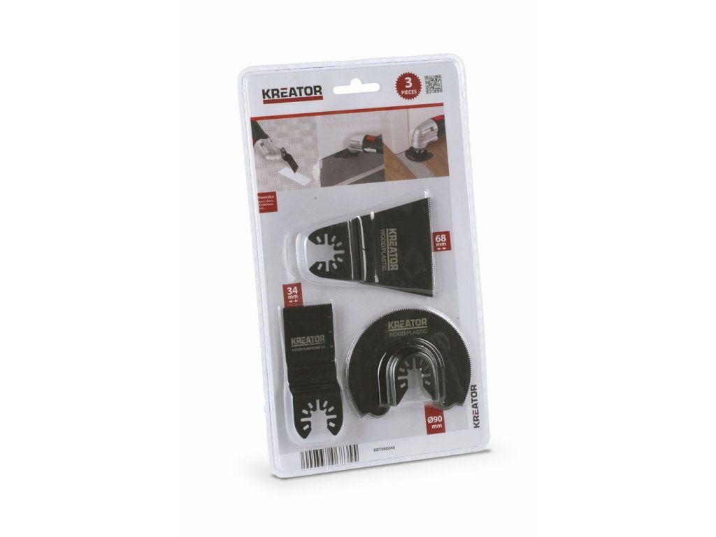 Set KRT990040 značky Kreator vám usnadní řezání do dřeva, kovu i plastu. V plastovém obalu se nachází řezné nože o délce 34 a 68 mm. K práci se vám také bude hodit segmentový řezný kotouč s rozměrem 90 mm.Specifikace: