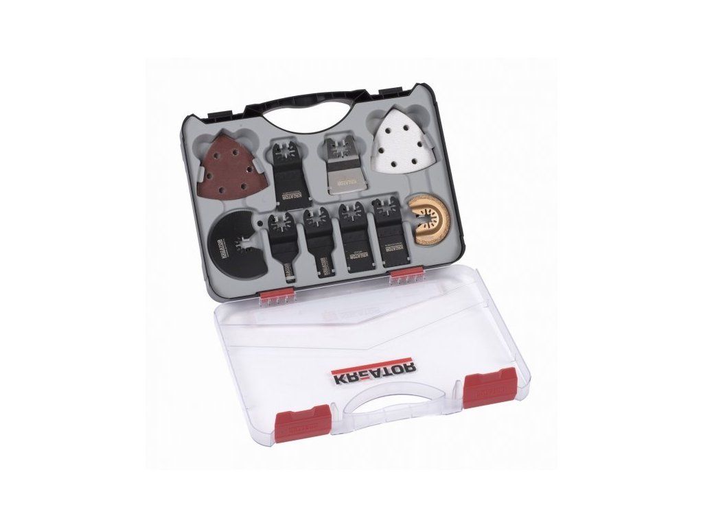 Set KRT990050 značky Kreator vám usnadní řezání do dřeva, kovu i plastu. V plastovém obalu se nachází HCS řezné nože o velikosti 10 a 20 mm. K práci se vám také bude hodit seškrabovací nůž na koberce, barvu i lepidlo z nerez oceli. V sadě se nacházejí i doplňky pro broušení, a sice šest kusů brusného papíru na dřevo i ocel a šest kusů brusného papíru na barvu.V průhledném kufříku také najdete BI-metal řezný nůž o rozměru 34 m a rovný velikosti 45 mm. Dále 34mm řezný nůž s hrubými zuby a kotouč s karbidovým povlakem ve velikosti 63,5 mm. Nechybí ani HSS řezný nůž o průměru 88 mm. Všechny potřebné díly jsou uložené v praktickém průhledném kufříku. Pouzdro se snadno otevírá a díky dvěma pevným klipsům. Madlo vám usnadní přenášení a zároveň za něj jde obal pověsit v dílně. Mějte vše potřebné vždy po ruce.