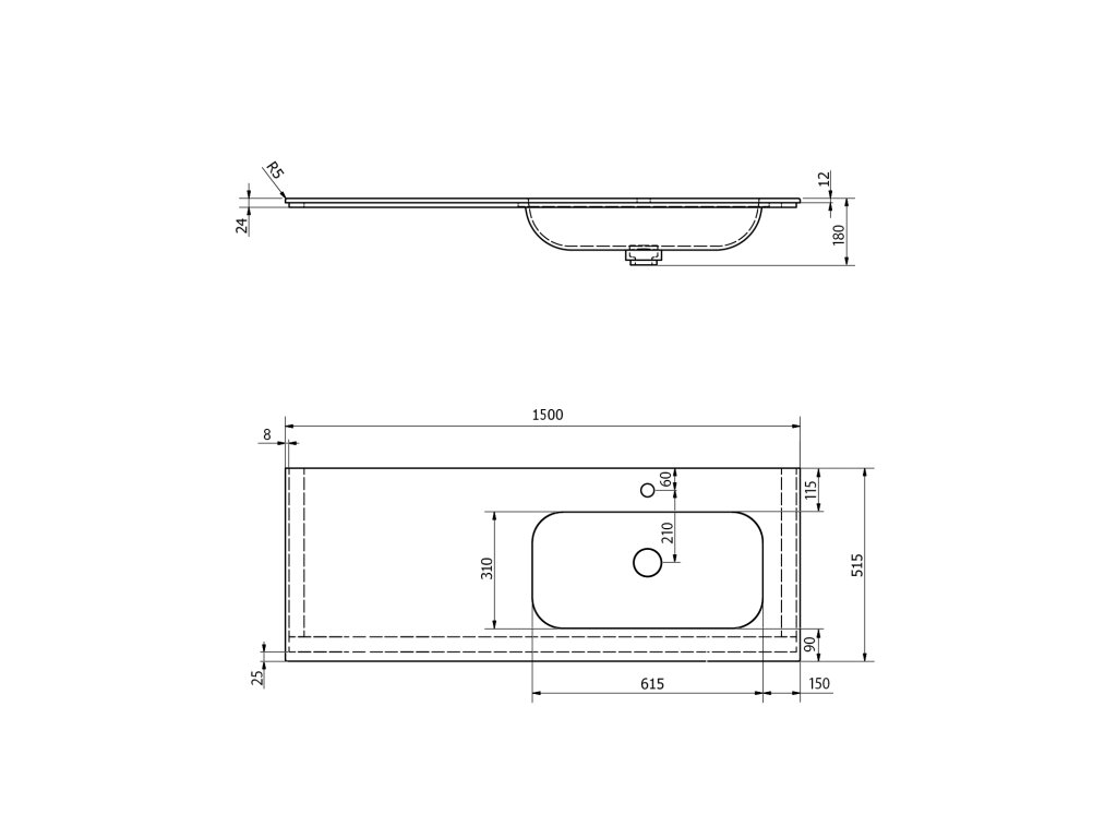 Zátka umyvadlové výpusti je vyrobena ze stejného materiálu jako umyvadlo. V otevřené poloze je zátka v jedné rovině se dnem umyvadla. Umyvadlo lze umístit na konstrukci, konzole nebo zakázkový nábytek.