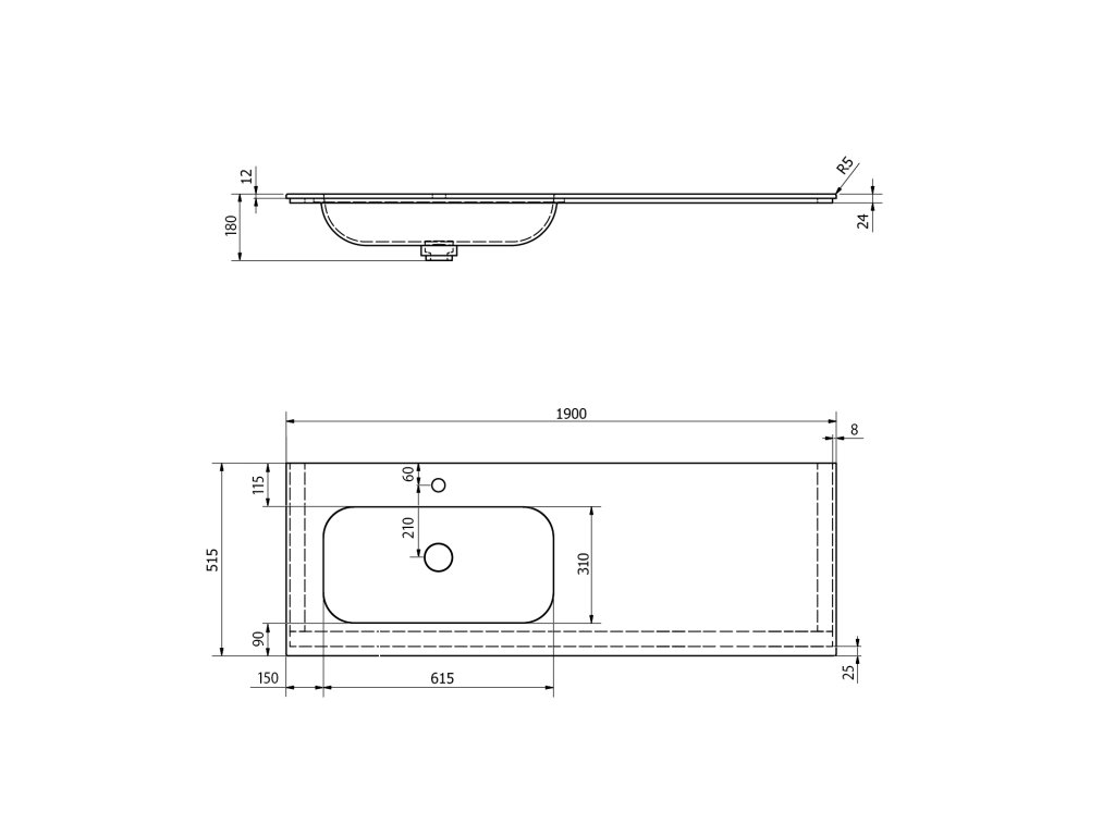 Zátka umyvadlové výpusti je vyrobena ze stejného materiálu jako umyvadlo. V otevřené poloze je zátka v jedné rovině se dnem umyvadla. Umyvadlo lze umístit na konstrukci, konzole nebo zakázkový nábytek.