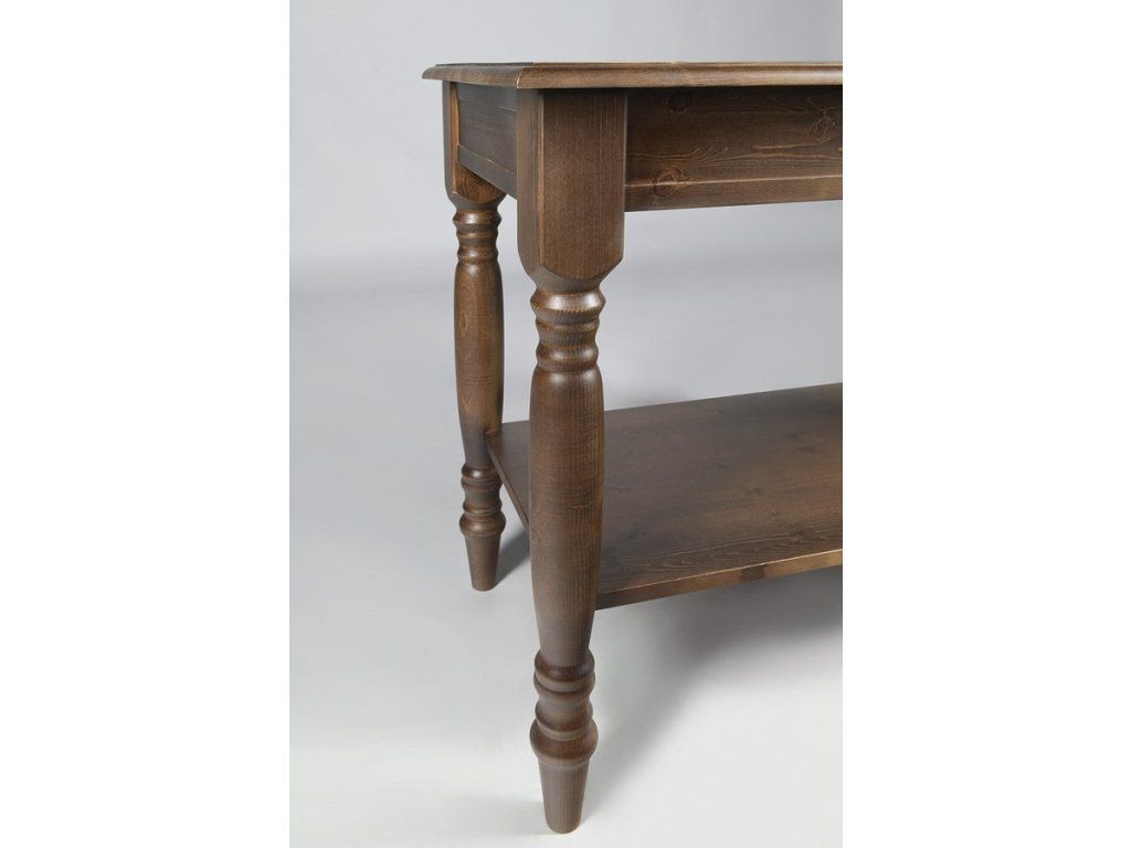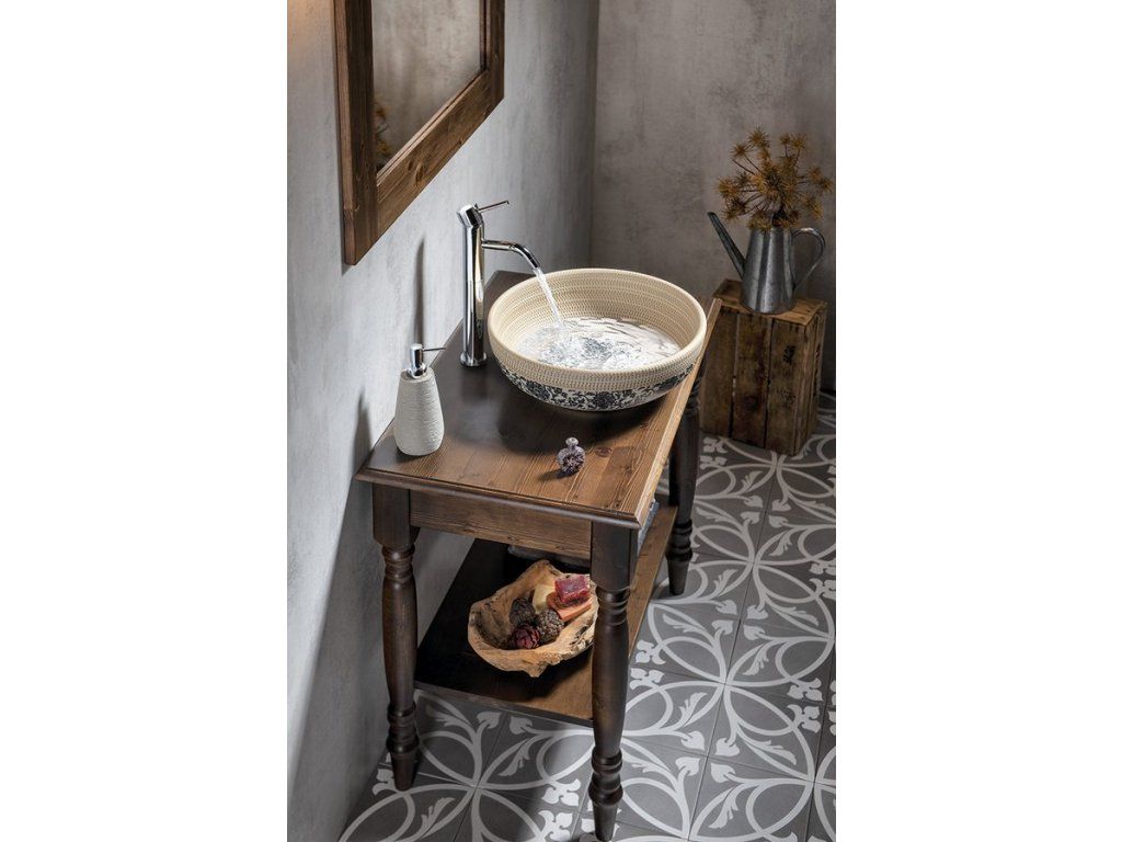 Umyvadlové stolky CIMBURA v rustikálním stylu navodí atmosféru venkovského stavení. Stolky jsou vyrobené ze smrkového masivu, mají soustružené nohy a řemeslná zručnost se odráží i v desce s oble vyřezanou hranou.
