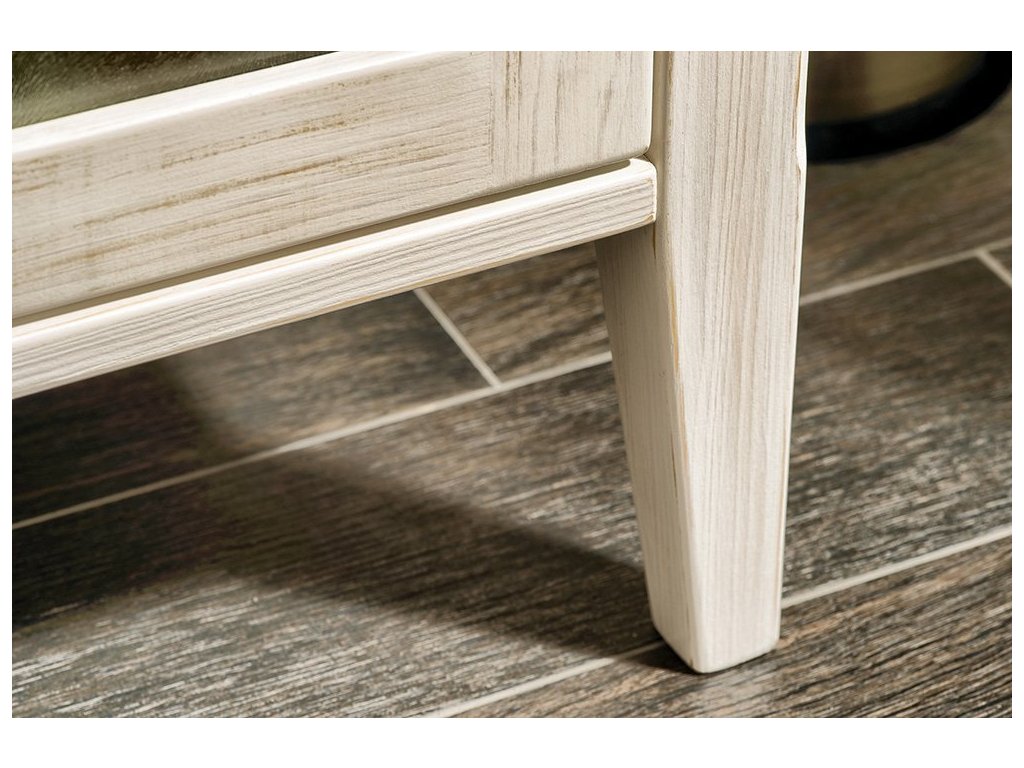 Skříňky v tmavém odstínu jsou napuštěny 2 vrstvami oleje: barevným pro sjednocení barvy dřeva a bezbarvým pro větší odolnost. U varianty ve starobílé jsou skříňky nabarveny bílou barvou, následně probroušeny pro docílení retro vzhledu a nakonec přelakovány bezbarvým lakem pro větší odolnost.