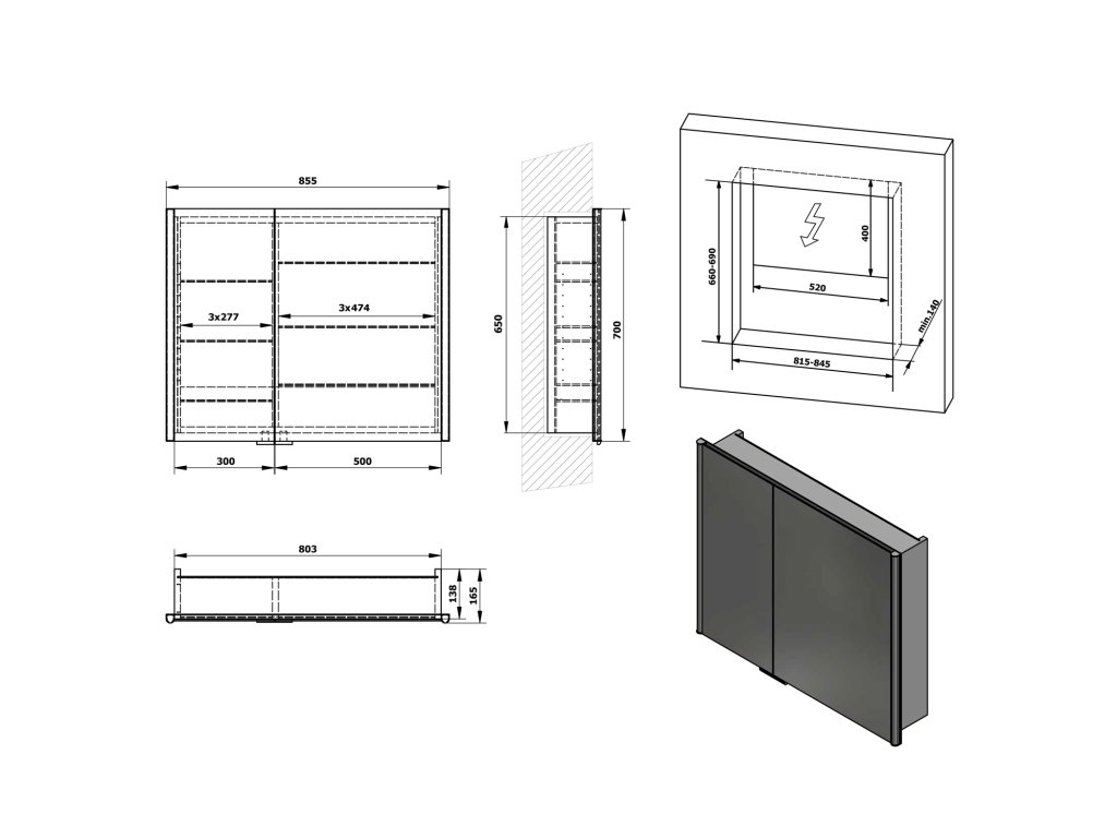| Výbava: | Osvětlení;Oboustranná zrcadlová dvířka;Zpomalovací panty;Zápustné do zdi |