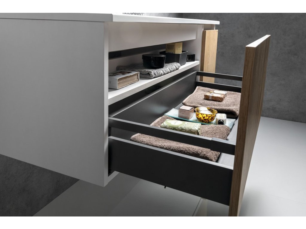 Čistý design série LOREA se vyznačuje jednoduchým bezúchytkovým otevíráním zásuvek. Sestavy zásuvkových skříněk v kombinaci s otevřenou policí nebo skříňkou nabízí rozměry od 70 do 180 cm. Pro tyto sestavy lze vybírat konsolová umyvadla Areca, polozápustná Brahea nebo z široké nabídky umyvadel na postavení, která lze na desce libovolně umístit.