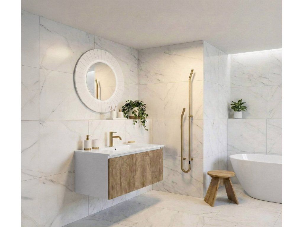 Uvnitř skříňky je nad zásuvkou praktická police na drobnosti každodenní potřeby. Pod hranu umyvadla lze instalovat tlumené LED osvětlení, které pro jeho nízkou spotřebu (1W) není nutné vypínat.