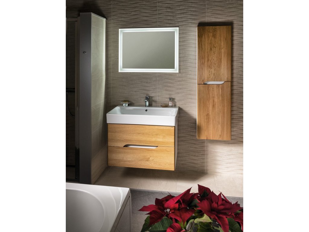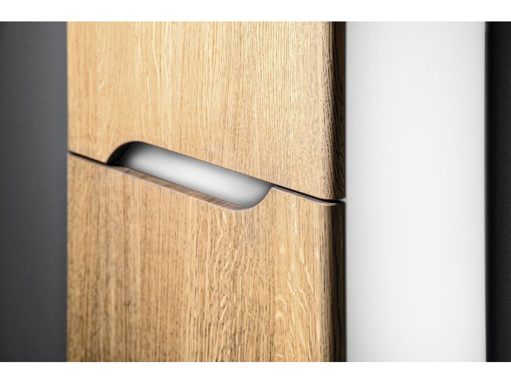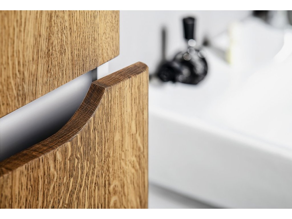 Série MEDIENA je kombinací bílé matné barvy a zásuvek z masivního dřeva, které svým zaoblením kopírují tvar keramických umyvadel SAND od italského výrobce GSI. Zásuvky s netradičním tvarem výřezu pro otvírání jsou vybaveny výsuvy BLUM s funkcí tlumení BLUMOTION s doživotní zárukou. Skříňky nabízíme buď celé v bílém matném provedení nebo v kombinaci korpus matná bílá a čela zásuvek ve 2 dekorech dubového dřeva (voskový olej dub natural a dub graphite). Šířky skříněk jsou 60, 80, 100 a 120 cm. V nabídce jsou též 2 typy doplňkových policových skříněk. Skříňku s prádelním košem získáte jednoduchým vyjmutím spodní police u doplňkové skříňky šíře 35 cm a instalací látkového prádelního koše na suchý zip.