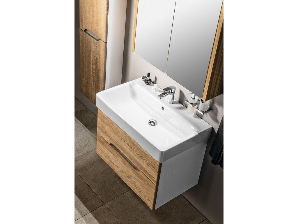 Série MEDIENA je kombinací bílé matné barvy a zásuvek z masivního dřeva, které svým zaoblením kopírují tvar keramických umyvadel SAND od italského výrobce GSI. Zásuvky s netradičním tvarem výřezu pro otvírání jsou vybaveny výsuvy BLUM s funkcí tlumení BLUMOTION s doživotní zárukou. Skříňky nabízíme buď celé v bílém matném provedení nebo v kombinaci korpus matná bílá a čela zásuvek ve 2 dekorech dubového dřeva (voskový olej dub natural a dub graphite). Šířky skříněk jsou 60, 80, 100 a 120 cm. V nabídce jsou též 2 typy doplňkových policových skříněk. Skříňku s prádelním košem získáte jednoduchým vyjmutím spodní police u doplňkové skříňky šíře 35 cm a instalací látkového prádelního koše na suchý zip.