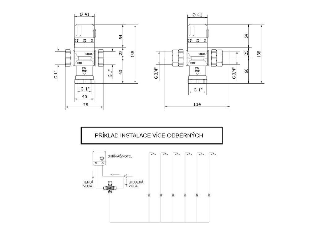 - Vstup teplá: F3/4" se zpětnou klapkou