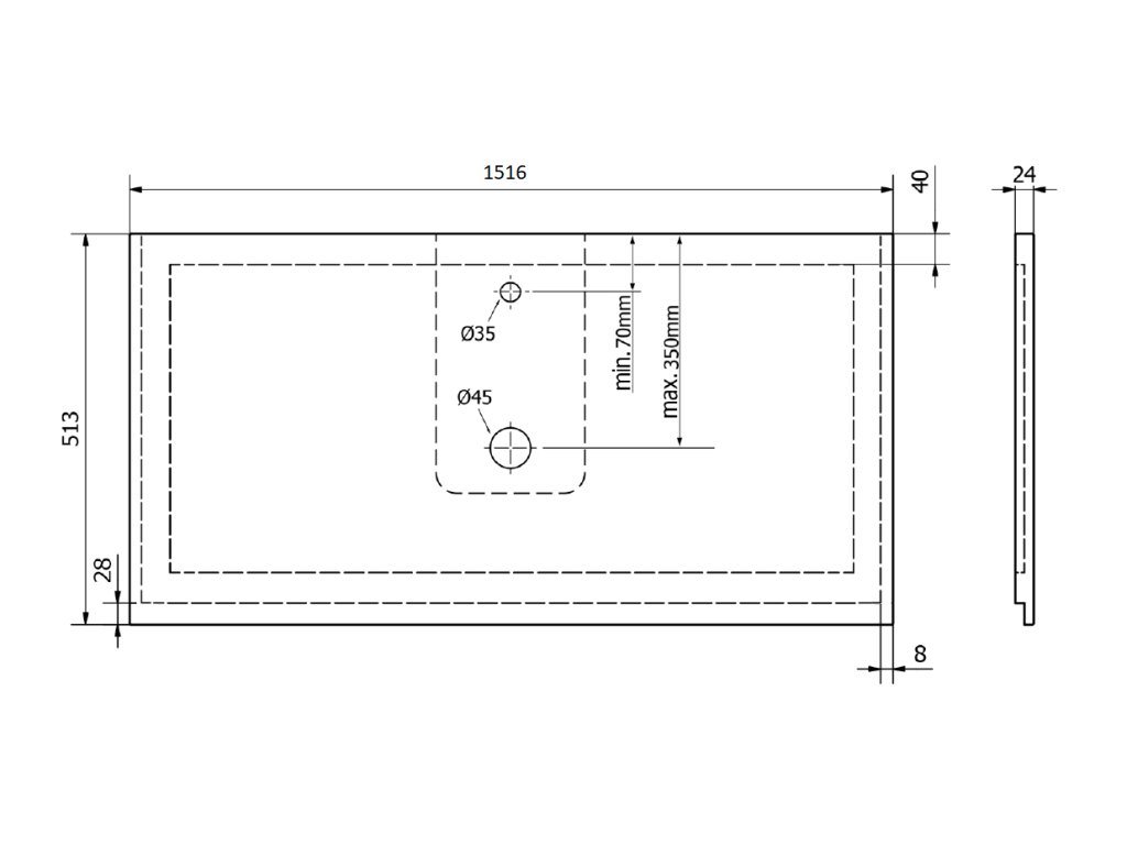 - Otvor pro baterii a výpust lze vyvrtat v místě instalace nebo dle výkresu ve výrobě