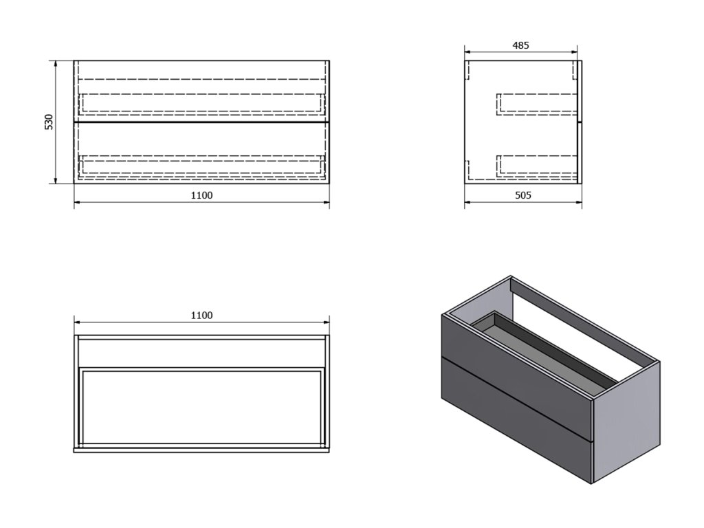 - Horní zásuvka s výřezem pro sifon v ose skříňky.