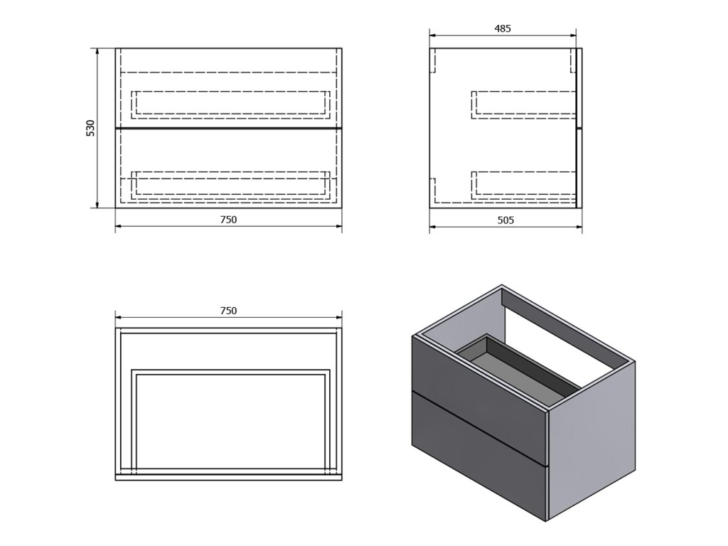 - Horní zásuvka s výřezem pro sifon v ose skříňky.