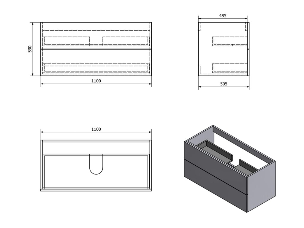 - Horní zásuvka s výřezem pro sifon v ose skříňky.