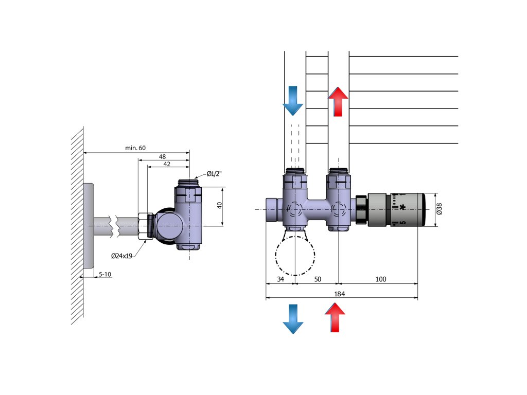 Ventil s termostatickou hlavicí: Integrovaný termostat udržuje nastavenou teplotu okolí. Termostatická hlavice musí být v místě přívodu teplé vody (mimo MONO ONE).