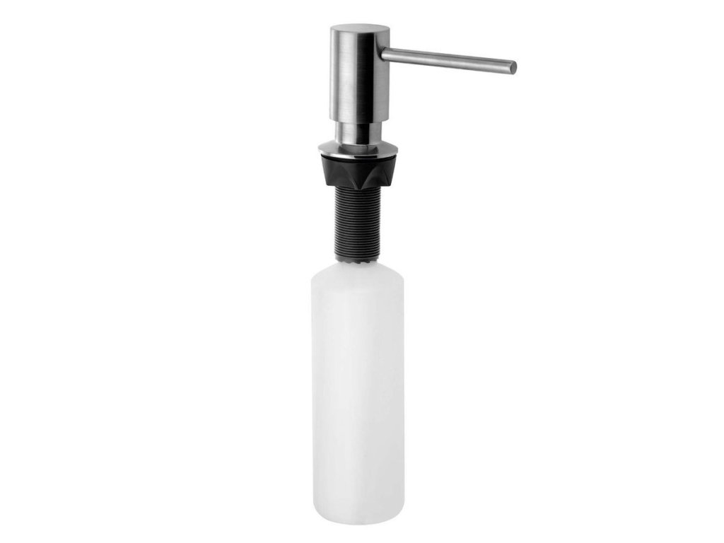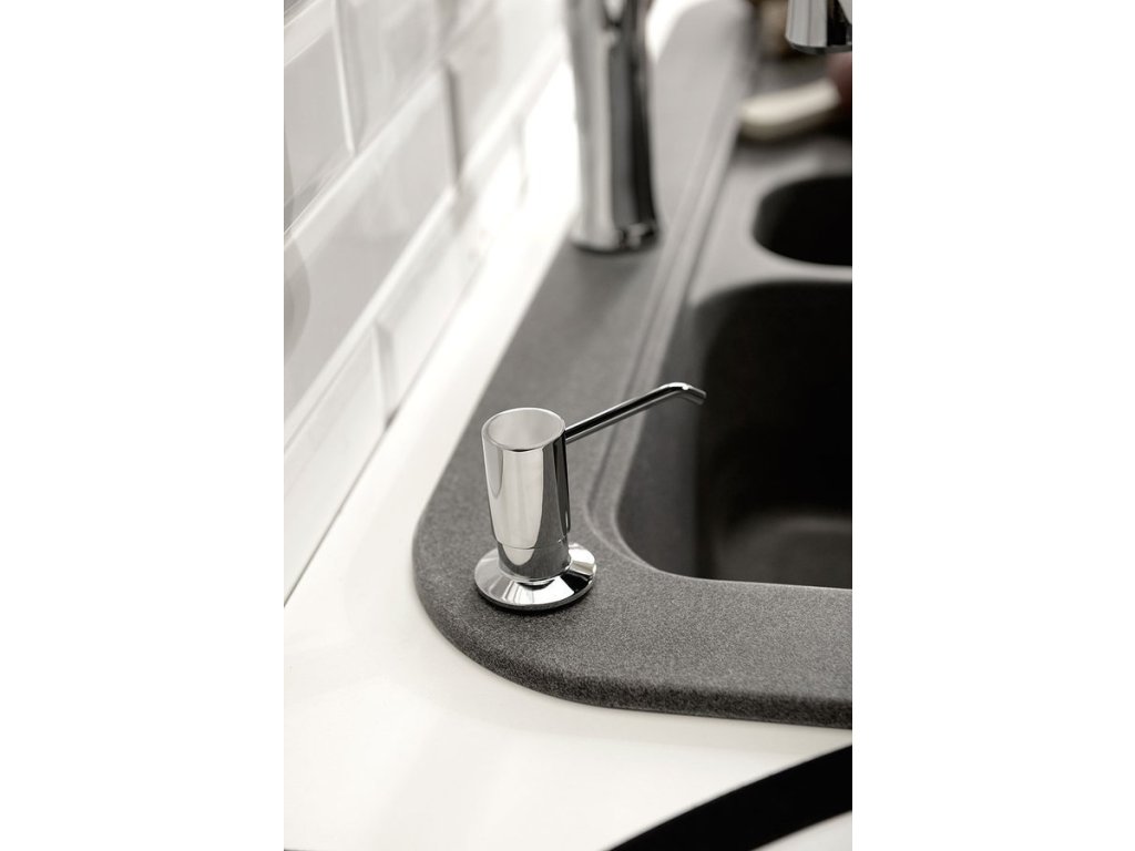 Zápustný dávkovač mýdla a saponátu s možností instalace do umyvadla místo stojánkové baterie, nebo do desky vedle umyvadla či dřezu.
