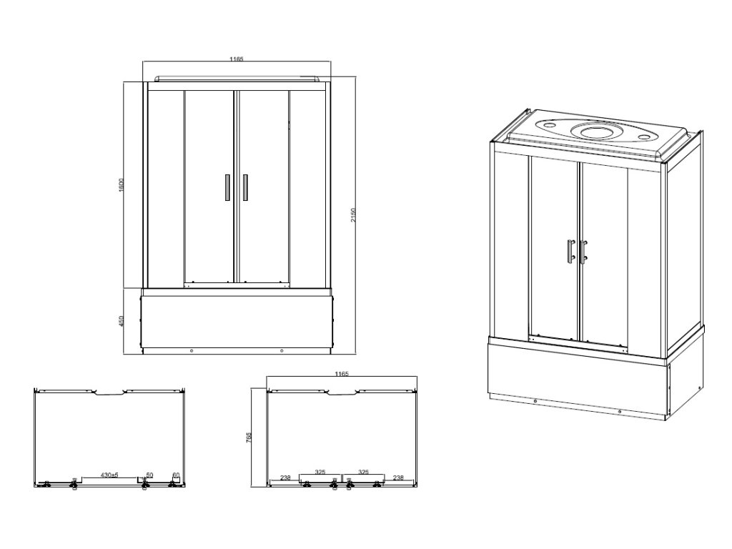 - součástí - integrované sedátko, dávkovače mýdla, ovládací panel s rádiem, osvětlení, skleněná polička