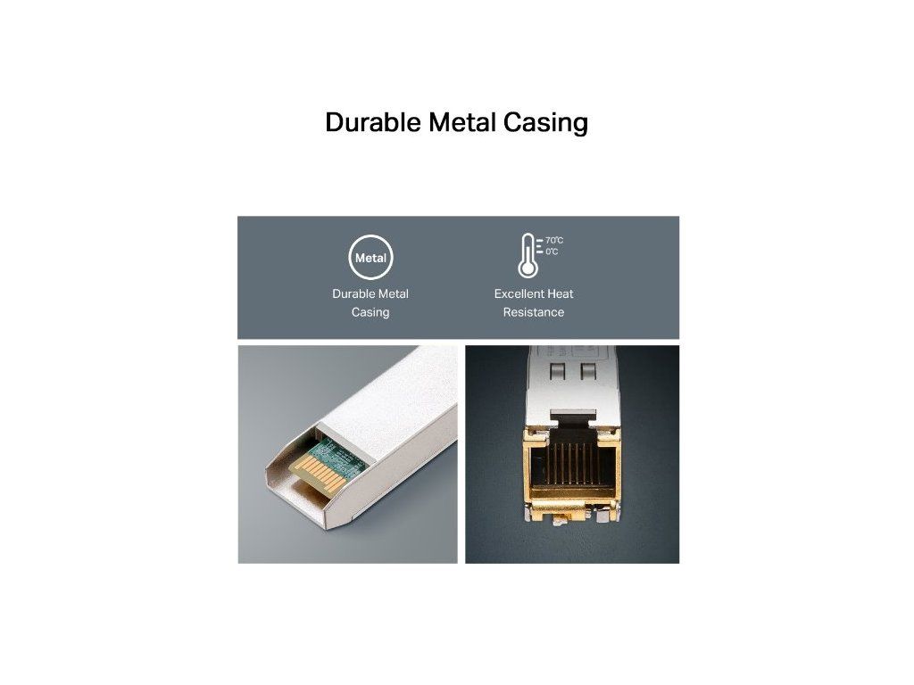 Vysoce kvalitní kovové pouzdro TP-Link TL-SM331T zajistí vyšší odolnost a spolehlivost za každé situace. Modul tak udrží stabilní připojení v různorodých prostředích i při vysokých teplotách až do 70 ℃. Je navíc velice efektivní, neboť na jeho portech dochází k nízké ztrátě energie (maximálně 0,8 W). Dále podporuje funkci TX Disable, tudíž mohou hostitelské systémy pracovat s intervalem pouhých 10 ms mezi po sobě jdoucími aktivacemi.