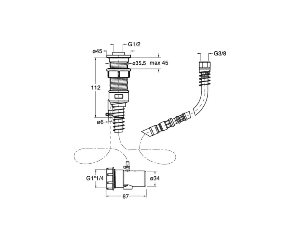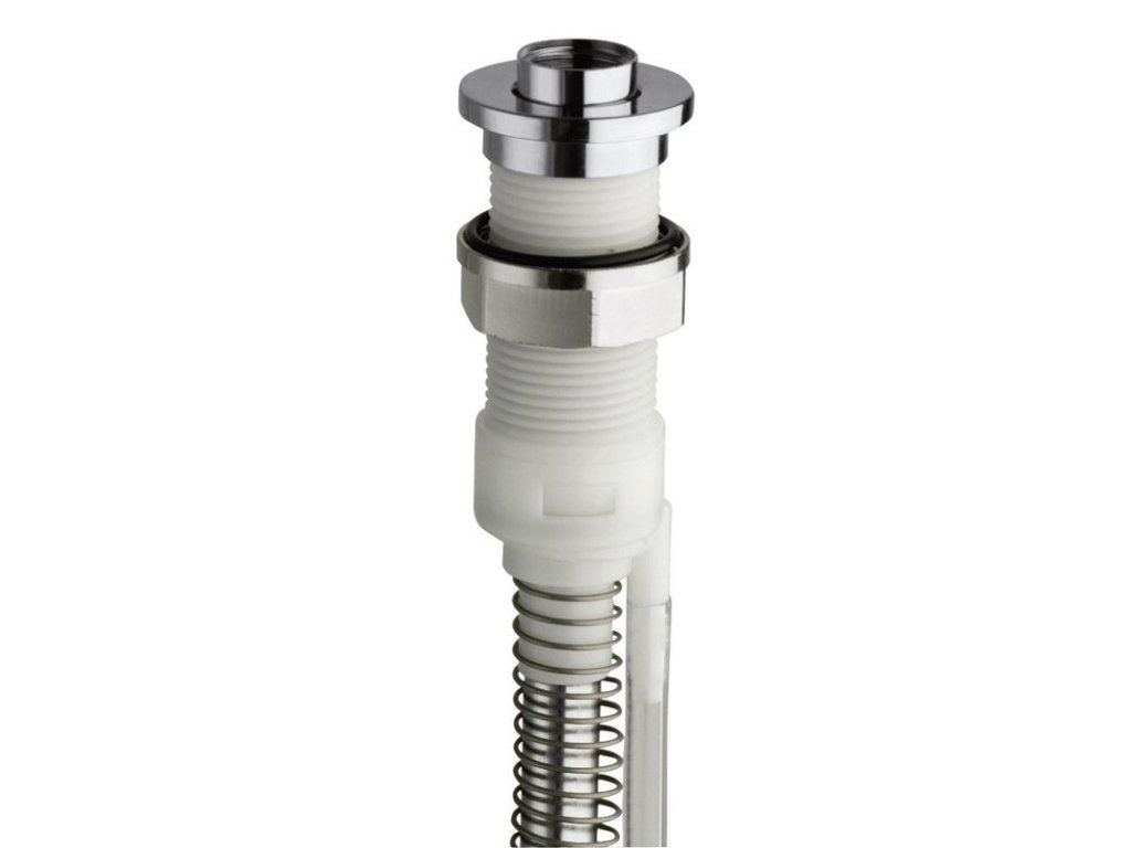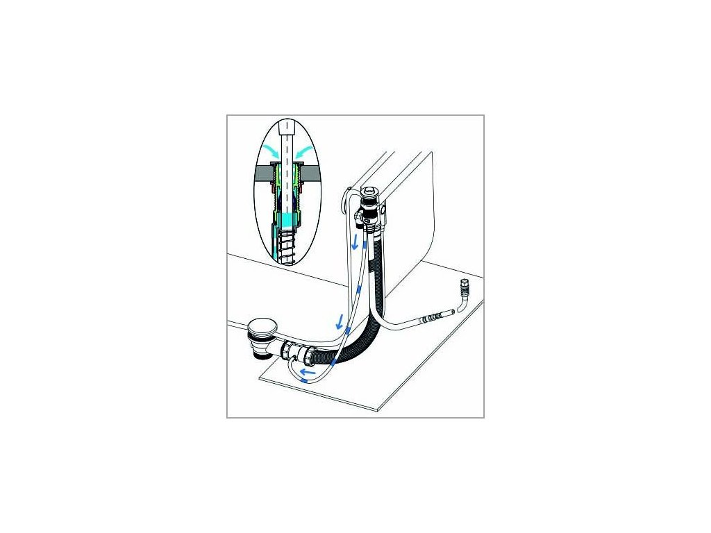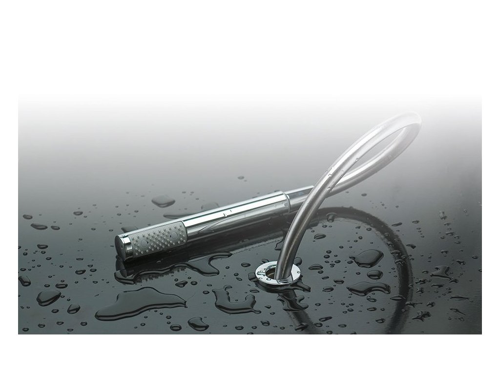 Systém výsuvu hadice pro montáž na hranu vany. Ruční sprcha se vratnou pružinou navrací zpět a zároveň je hadice osušena. Systém navíc pomocí drenáže zamezuje zatékání vody pod vanu.