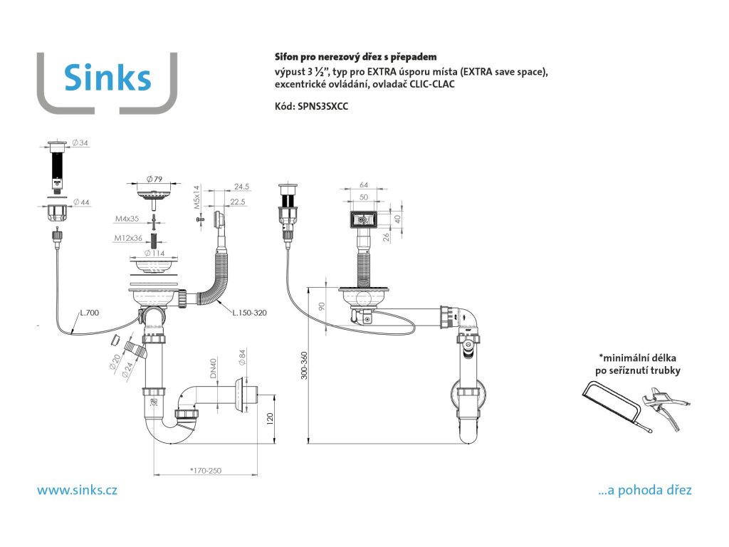 Sinks sifon 3 ½" pro nerez. dřezy s extra úsporou místa a s exc. ovladačem (clic-clac) SPNS3SXCC