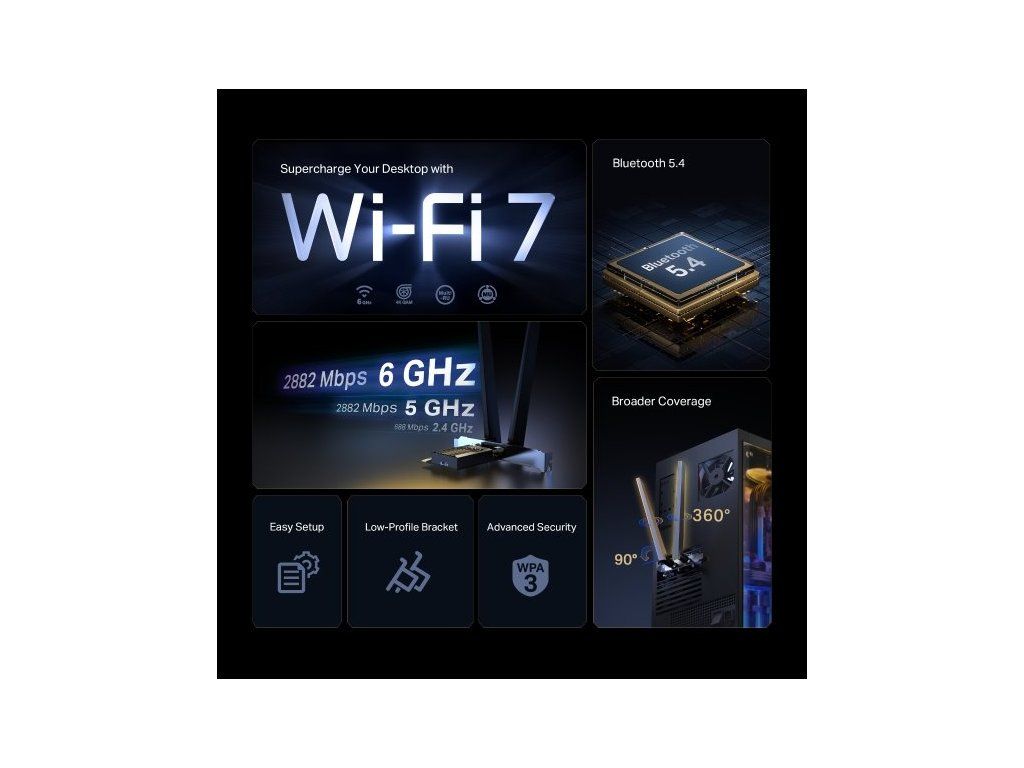Síťová karta Archer TBE400E od značky TP-Link poskytuje bezkonkurenční rychlost ve 3 pásmech. Pásmo 6 GHz umožňuje rychlost připojení až 2 882 Mbit/s, pásmo 5 Ghz 2 882 Mbit/s a pásmo 2,4 GHz 688 Mbit/s. Podporuje standardy Wi-Fi 7, takže je ideální pro práci, HD streamování nebo hraní her.