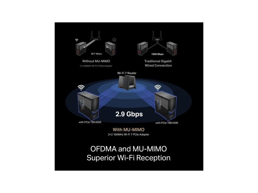 - Minimální zpoždění počítače díky technologii OFDMA a MU-MIMO