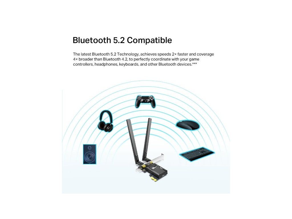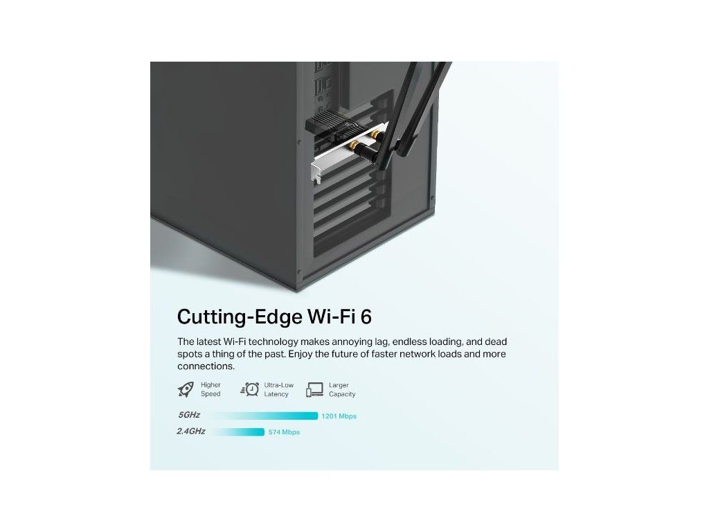 Síťová karta Archer TX20E od značky TP-Link poskytuje bezkonkurenční rychlost ve 2 pásmech. Pásmo 5 GHz umožňuje rychlost připojení až 1 201 Mbit/s a pásmo 2,4 GHz 574 Mbit/s. Podporuje standardy Wi-Fi 6, takže je ideální pro práci, streamování nebo hraní her.
