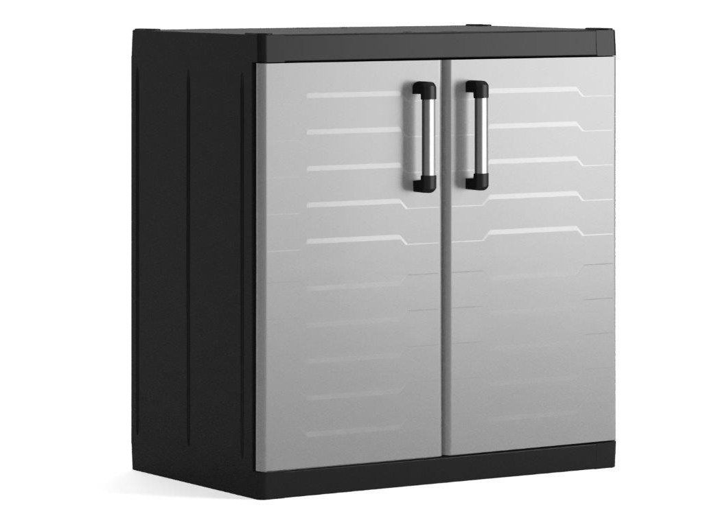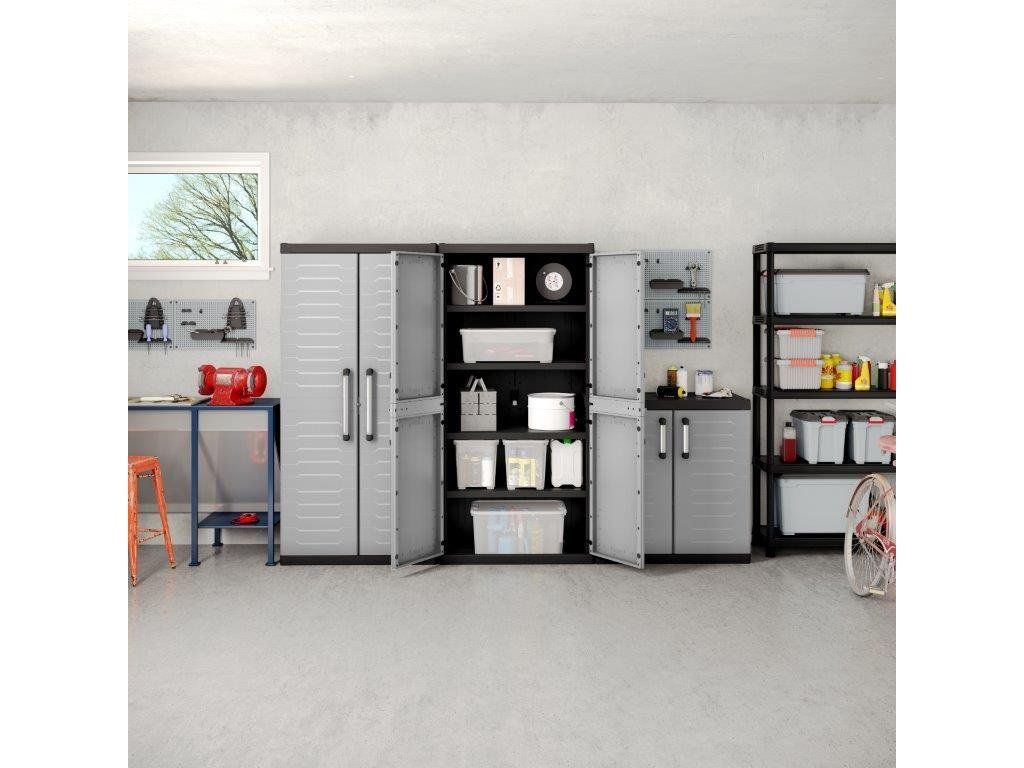 Skříň obsahuje celkem 2 přídavné police - každá s výraznou nosností až 25 kg, které přijdou vhod pro výrazně těžší předměty všeho druhu. Lze ji tedy využít pro skladování dílenského nářadí či zahradnických potřeb, například pro uložení náčiní, které by se jinam nevešlo. Díky svému provedení v neutrální šedé barvě zapadne do každého prostoru bez ohledu na jeho konceptuální styl.