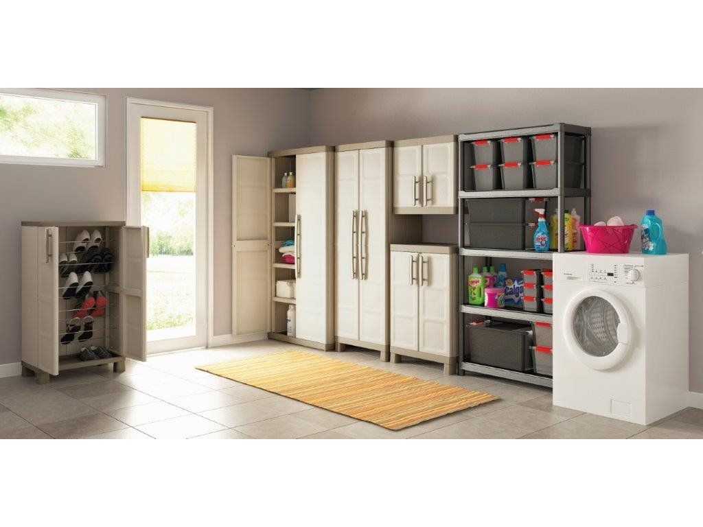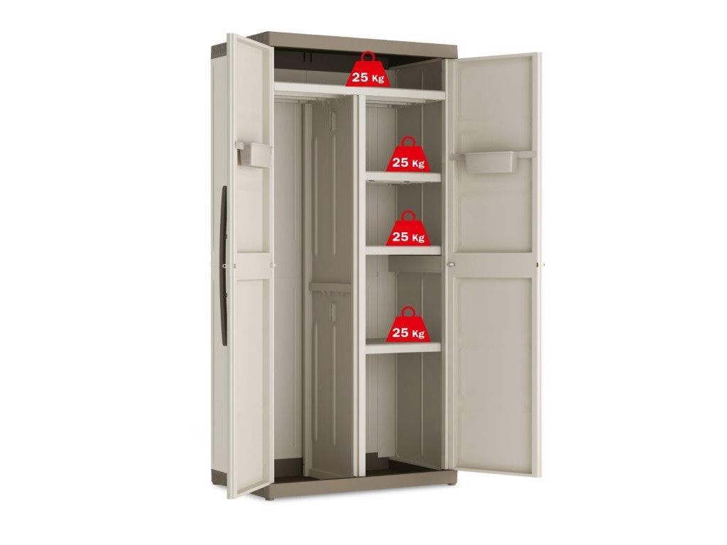 Skříň obsahuje celkem 3 přídavné police - každá s výraznou nosností až 25 kg, které přijdou vhod pro výrazně těžší předměty všeho druhu. Lze ji tedy využít pro skladování dílenského nářadí či zahradnických potřeb, kdy přijde vhod pro uložení náčiní s dlouhou násadou, které by se jinam nevešlo. Díky svému provedení v univerzální béžové barvě zapadne do každého prostoru bez ohledu na jeho konceptuální styl.