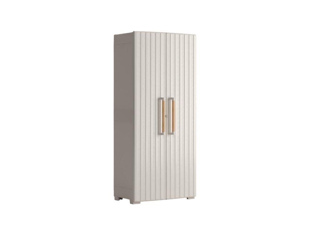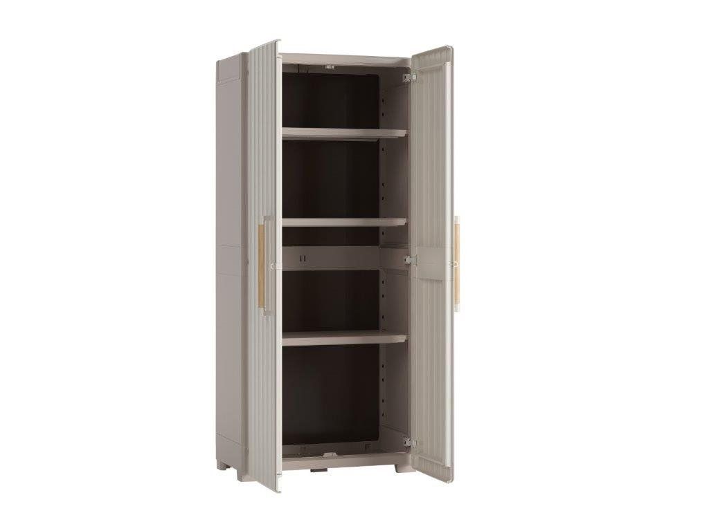 Skříň Keter Groove High vám zajistí dostatek úložného prostoru na nářadí, zahradní náčiní, pomůcky na uklízení a další věci. Využijete ji jak v interiéru, tak v exteriéru. Tato elegantní a praktická skříň perfektně doplní vybavení vaší garáže, dílny i zahradního domku. Dřevěná madla a kovové panty vám umožní skříň otevřít doširoka, takže máte pohodlný přístup k uloženým předmětům.