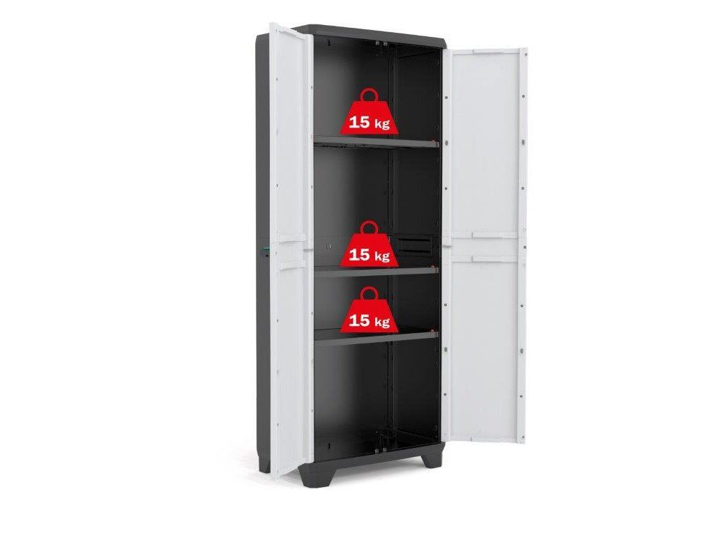 Skříň je vyrobena z kvalitního plastu, který je pevný, lehký a odolný. Díky třem výškově nastavitelným policím si interiér snadno přizpůsobíte podle velikosti ukládaných předmětů. Modré ergonomické úchyty umístěné na středu dveří zajišťují pohodlné otevírání i při plném zatížení.
