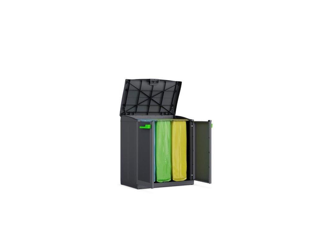 Skříň Keter Moby Compact Store umožňuje přehledné třídění až tří druhů odpadu. Každá komora pojme standardní pytel o objemu 110 litrů. Horní víko slouží k vhazování, čelní dveře umožní snadný přístup k plným pytlům. Box se hodí nejen pro papír, plasty a sklo, ale také pro biologický nebo komunální odpad.