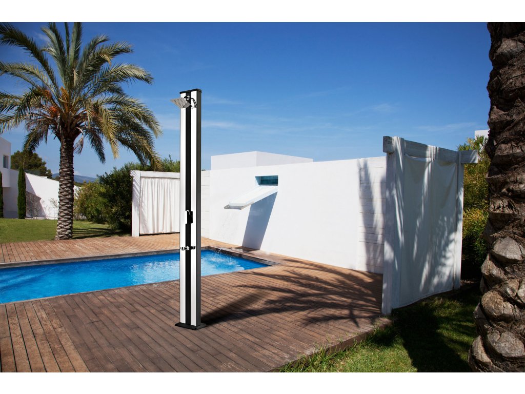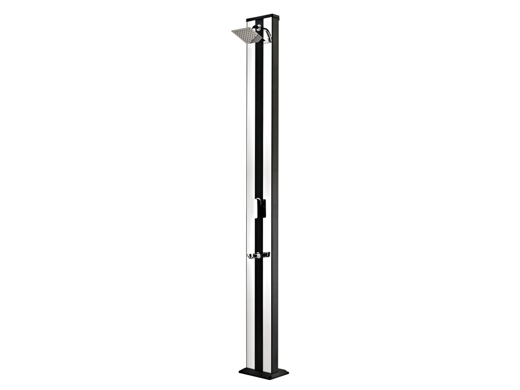 Solární sprcha CF Aluminium Hliníková solární sprcha s XXL zásobníkem o objemu 38 l a velkou sprchovací hlavicí, která zajišťuje příjemné sprchování připomínající lehký letní deštík. Sprcha je vyrobena zhliníku a nerezu, má kovovou pákovou baterii a je vysoká 218 cm. Je vybavena praktickým kohoutkem na oplach nohou. Celkově je sprcha velmi kvalitně zpracována a má luxusní vzhled. Připojení na přívod vody je velmi jednoduché pomocí hadicové rychlospojky (součástí balení). Solární sprcha je ideální zdroj teplé vody bez použití elektřiny. Voda je v solárním zásobníku jednoduše ohřívána sluníčkem až na 60°C. Ktomu přispívá i černé provedení sprchy. Sprcha je vybavena mísící pákovou baterií, abyste si nastavili teplotu vody, která vám bude vyhovovat. Montáž sprchy je velmi jednoduchá a zvládnete ji sami. Solární sprcha se připevní kpodkladu pomocí 4 šroubů, které jsou součástí balení. Pak už stačí připevnit zahradní hadici a je to hotové. Pokud nechcete sprchu připevňovat kzemi, můžete ke sprše dokoupit podlahový podstavec a připevnit ksprchu kněmu. Pokud je podstavec dostatečně velký (např. Podstavec k solární sprše Planet Pool), zajistí samonosnost sprchy a není ho potřeba více kotvit. Podstavec je praktickým doplňkem ksolární sprše – je protiskluzový, bezpečný a sodtokem vody. Sprchu připevněnou kpodstavci lze snadno přenést na jiné místo vzahradě. Sprcha slouží nejen pro osvěžení, ale doporučujeme se osprchovat před každým koupáním ve vašem bazénu. Do vody se pak dostává méně nečistot, což snižuje spotřebu bazénové chemie a potřebu péče o bazén. Parametry:Materiál hliník, nerezPoužití k bazénu i do zahradyObjev solárního zásobníku 38 lMax. teplota vody 60°CVýška sprchy 218 cmVáha 15 kgVelikost sprchovací hlavice 15 x 15 cmVelikost základny 18 x 25 cmBarva černá, stříbrnáRegulace poměru studené a teplé vody anoKohoutek na oplach nohou anoPřipojení na zahradní hadici ano, součástí baleníKotvení kotvící šrouby, součástí baleníDoplňkové parametry