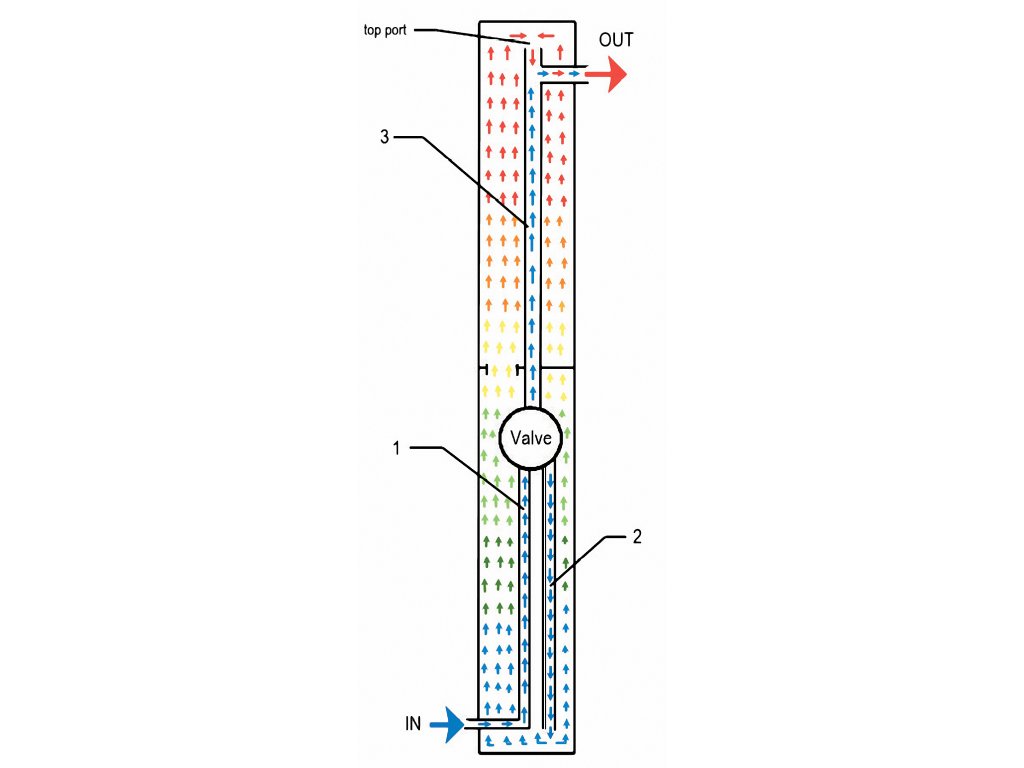 Studená voda do solární sprchy vstupuje napájecím ventilem označeným jako VSTUP. Pokud chcete užít teplouv vodu, dejte pákovou baterii do pozice "TEPLÁ" (označeno červenou barvou). V této pozici proudí vstupní studená voda potrubím č.1 a č.2 přes ventil č.5. Potrubí č.3 je nyní zavřené. Studená voda proudí otevřeným prostorem solární sprchy, který je zahříván slunečním zářením. Voda proudí od spodní části sprchy k vrchu a mísí se s již zahřátou vodou. Do ústí VÝSTUP vstupuje skrz otevřenou bránu č. 4.
