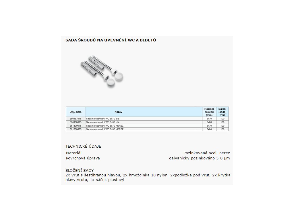 - složení sady: 2x vrut s šestihrannou hlavou, 2x hmoždinka 10 nylon, 2x podložka pod vrut, 2x krytka hlavy vrutu, 1x sáček plastový