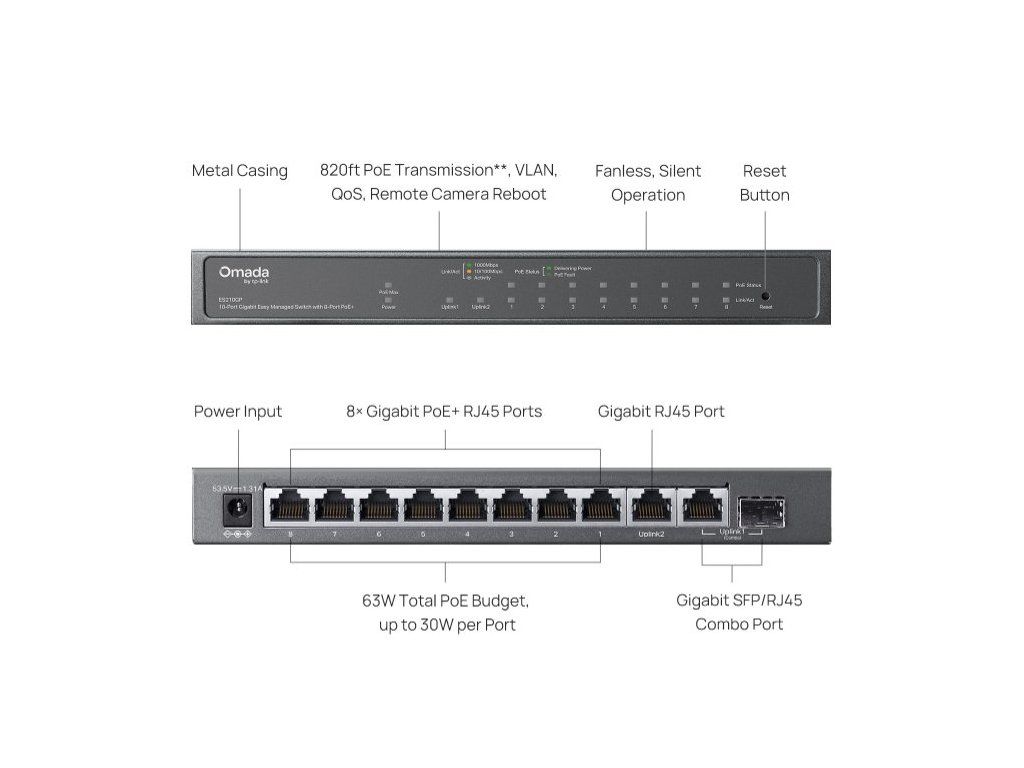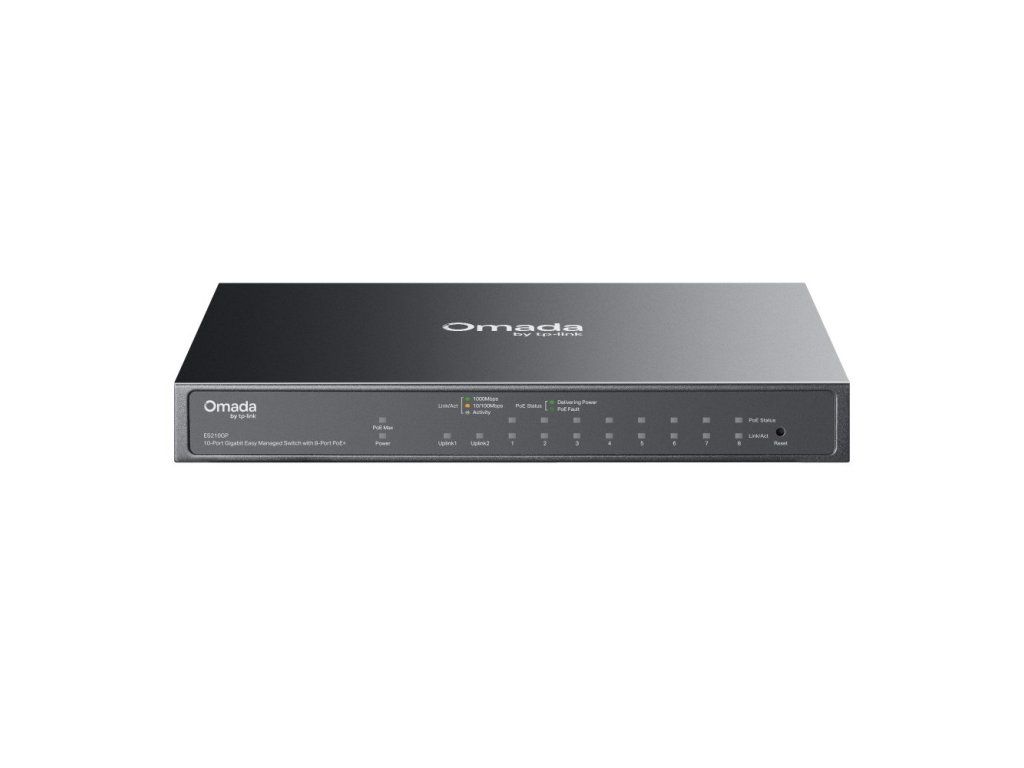 - Počet portů: 9× RJ45 (z toho 8× PoE+), 1× combo RJ45/SFP