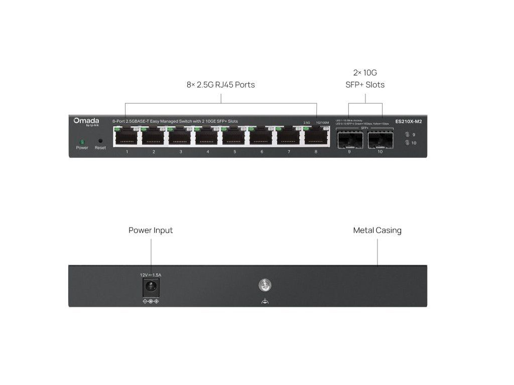 Switch nabízí osm 2,5Gb/s RJ45 portů s automatickou detekcí rychlosti a dva 10Gb/s SFP+ sloty pro vysokorychlostní uplink nebo propojení serverů. Díky přepínací kapacitě 80 Gb/s a přenosové rychlosti 59,52 Mpps zvládne bez problémů i datově náročné aplikace, jako je NAS úložiště, virtualizace nebo 4K video produkce.
