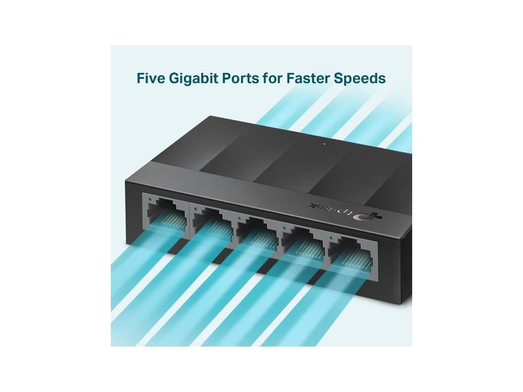 5portový stolní switch LS1005G světoznámé značky TP-Link poskytuje přenosovou rychlost LAN portů 1000 Mbps. Všech pět portů podporuje funkci Auto MDI / MDIX a vy se tak nemusíte starat o to, který kabel máte připojit.