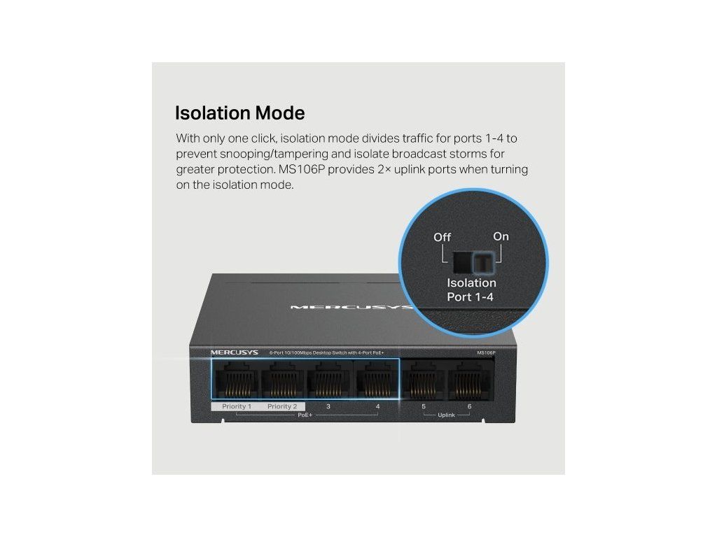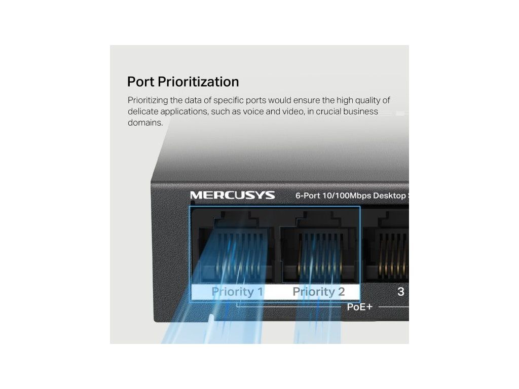 Se switchem Mercusys MS106P od TP-Link získáte stabilní připojení, které se hodí hlavně v menších firmách, ubytovnách nebo kancelářích. Poskytne vám šest 10/100Mbps portů RJ45, z nichž 4 podporují PoE+. K napájení a přenosu dat vám postačí jeden ethernetový kabel. Jistě vás potěší také tichý chod a nízká spotřeba energie díky bezventilátorovému provedení. Odolný kovový kryt dobře odvádí teplo.