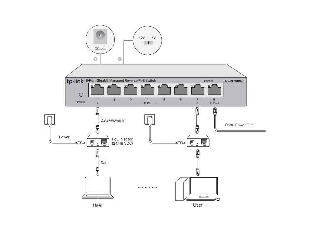Do POE-in portů je možné připojit různá vstupní napětí, na výstupu bude přítomno vždy nejvyšší z nich. V případě výpadku napětí od jednoho klienta se automaticky přepne vstupní napětí na dalšího možného. Na zadní straně je navíc DC výstupní jack (5,5 / 2,1 mm) s přepínačem mezi 5 V a 12 V. O korektní výstupní napětí se stará integrovaný měnič napětí.