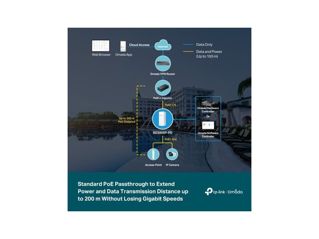 Switch TP-Link SG2005P-PD využijete ve venkovním prostředí. Je totiž vybavený krytím IP55, které ho chrání před povětrnostními vlivy. Jeho pouzdro odolá vodě, prachu, UV záření a dokonce je vybavené ochranou před bleskem (4kV).