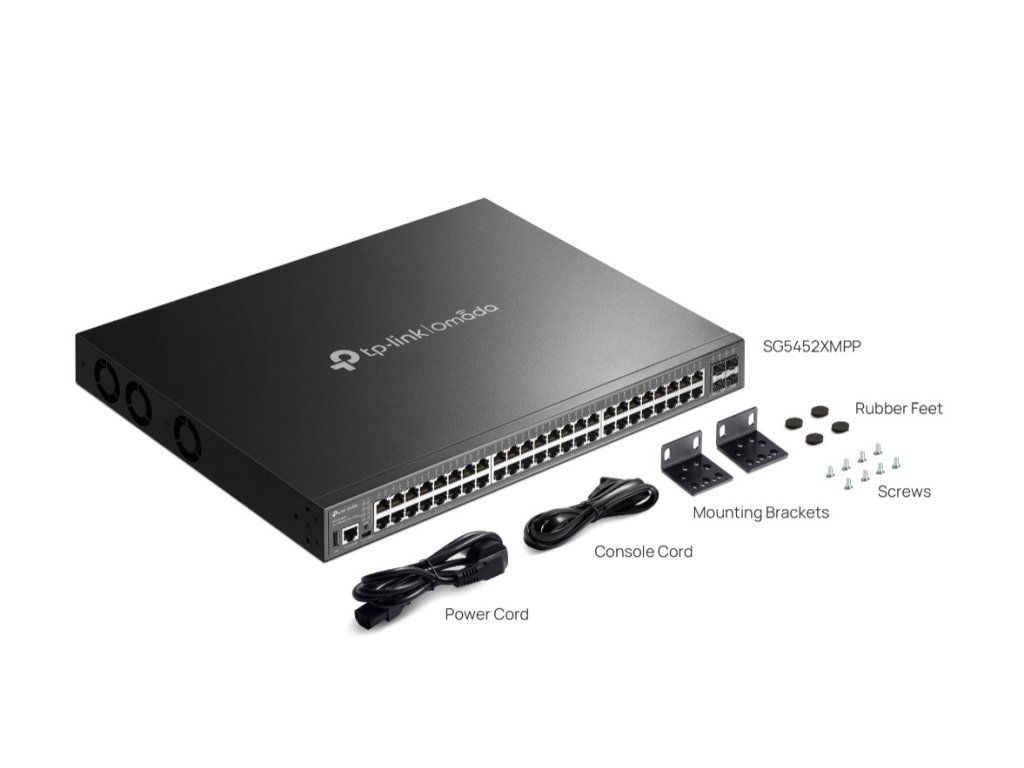 Spravovaný L3 PoE++ switch TP-Link SG5452XMPP je navržen pro vysokou hustotu připojení, maximální napájecí výkon a robustní správu v podnikových sítích i u ISP. Nabízí 48 gigabitových PoE portů (8× PoE++ až 90 W a 40× PoE+ až 30 W), 4× 10Gbps SFP+ uplinky, 770W PoE rozpočet a fyzické stohování až 4 jednotek. Podporuje Perpetual PoE, Fast PoE, pokročilé směrování L3, ochranu v kruhové topologii (ERPS) a centralizovanou správu přes Omada SDN.