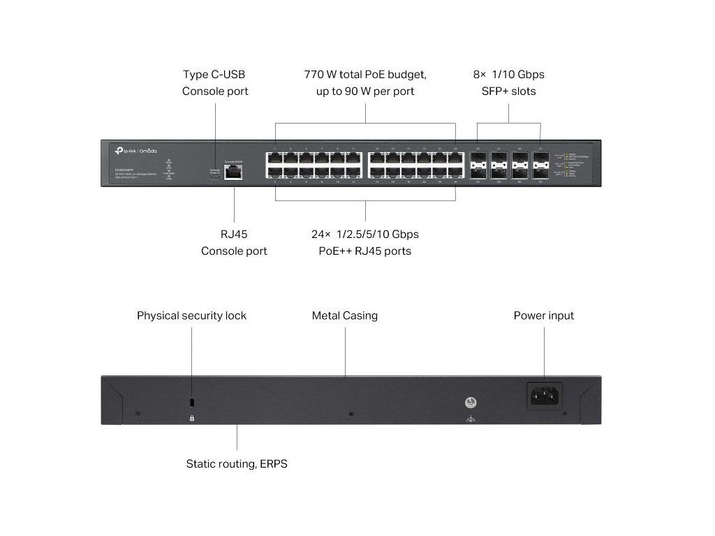 S řízeným switchem SX3832MPP od TP-Link získáte bleskurychlé 10G připojení, které využijete hlavně ve firmách a provozovnách. Tento plně řízený switch vám poskytne 24 portů 1/2,5/5/10 Gb/s RJ45 PoE++ a 8 portů 1/10G SFP+. Těšit se můžete na přepínací kapacitu 640 Gbit/s. Odolné kovové pouzdro umožňuje montáž do racku.