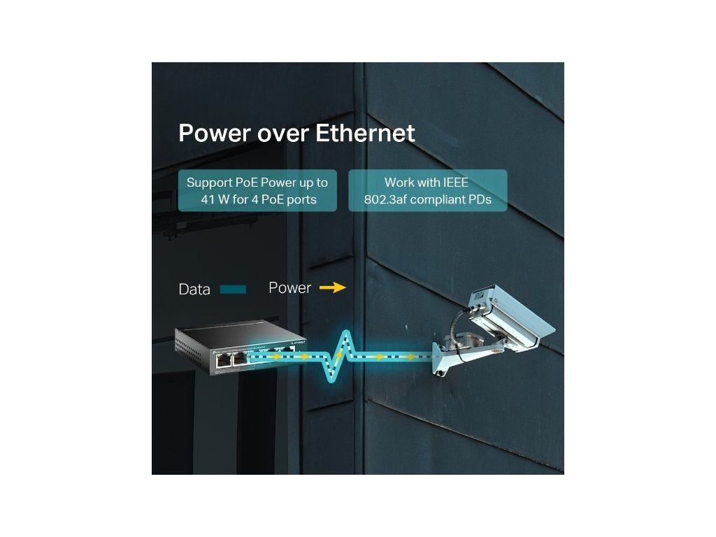 Celkem 4 z 5 portů s konektory RJ-45 podporují napájení přes Ethernet. TL-SF1005LP tak umí přenést k danému kompatibilnímu zařízení až 15,4 W na 1 port. Celkový maximální příkon pak dosáhne až na 41 W. Switch navíc umí tyto PoE porty automaticky detekovat a spolehlivě tak napájí všechna libovolná PD zařízení, která podporují standard IEEE 802.3af.