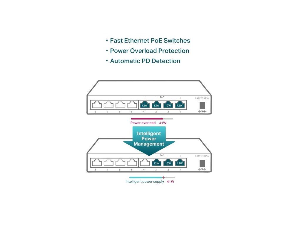 Celkem 4 z 8 portů s konektory RJ-45 podporují napájení přes Ethernet. TL-SF1008LP tak umí přenést k danému kompatibilnímu zařízení až 15,4 W na 1 port. Celkový maximální příkon pak dosáhne až na 41 W. Switch navíc umí tyto PoE porty automaticky detekovat a spolehlivě tak napájí všechna libovolná PD zařízení, která podporují standard IEEE 802.3af.